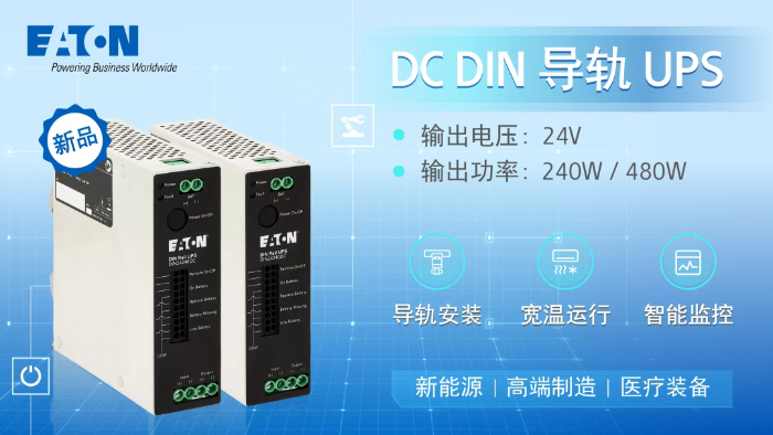 伊顿新型 DC DIN 导轨 UPS 采用直流输入和直流输出设计,一款集齐 24V 240W/480W 两种功率规格,支持 DIN 导轨式安装,还可扩展电池模块,有效解决电源产品耐用性差、维护繁琐,低能效等问题,大幅减少停机时间,以高可靠供电助力工业智能化升级。